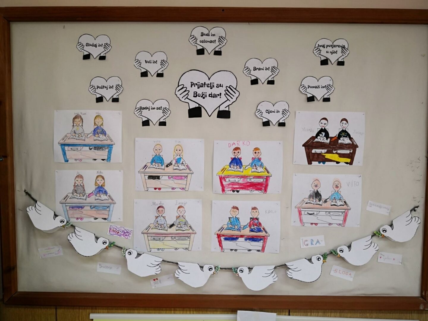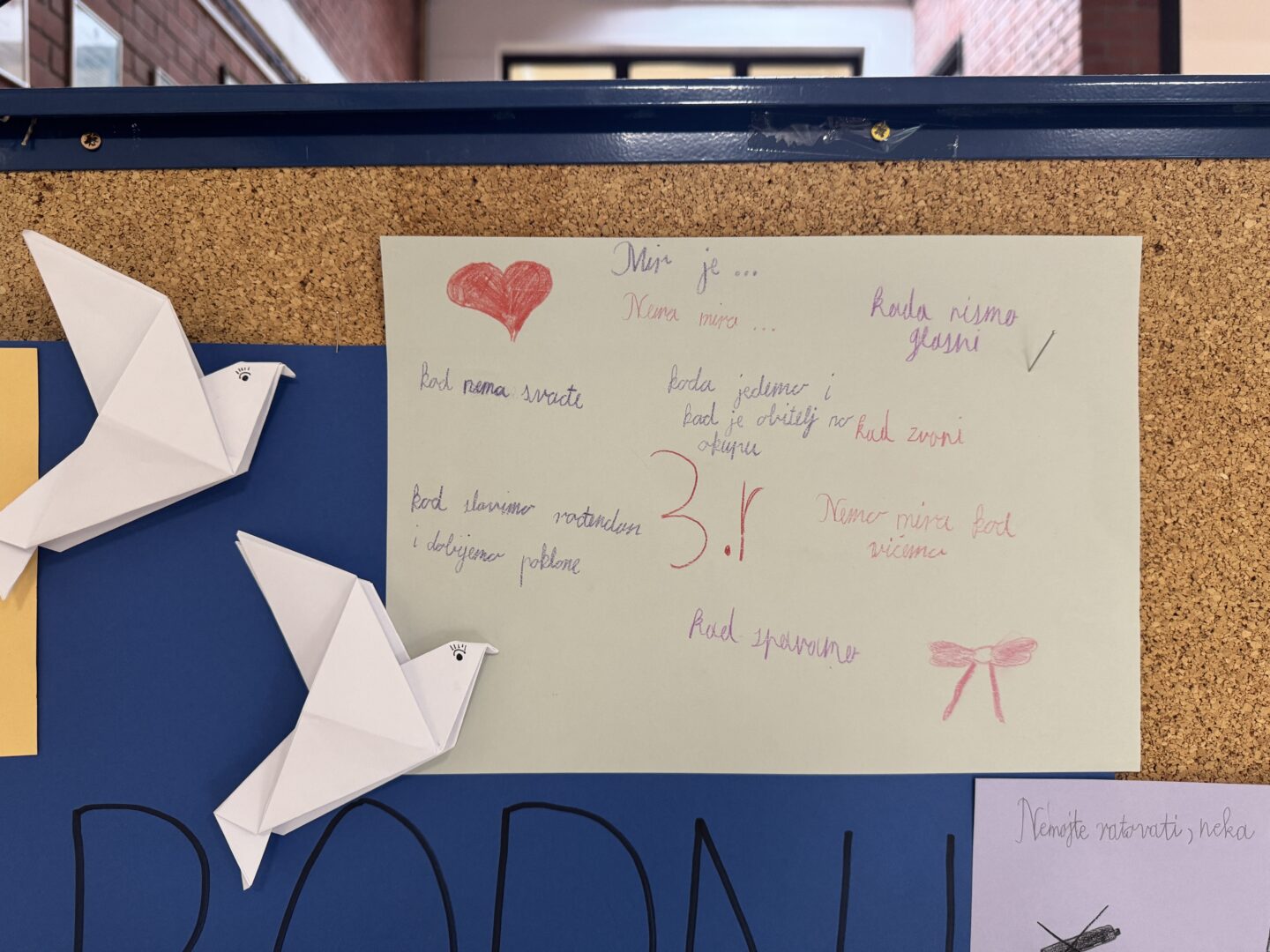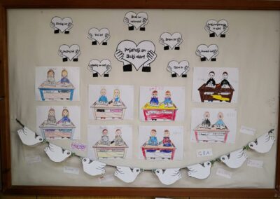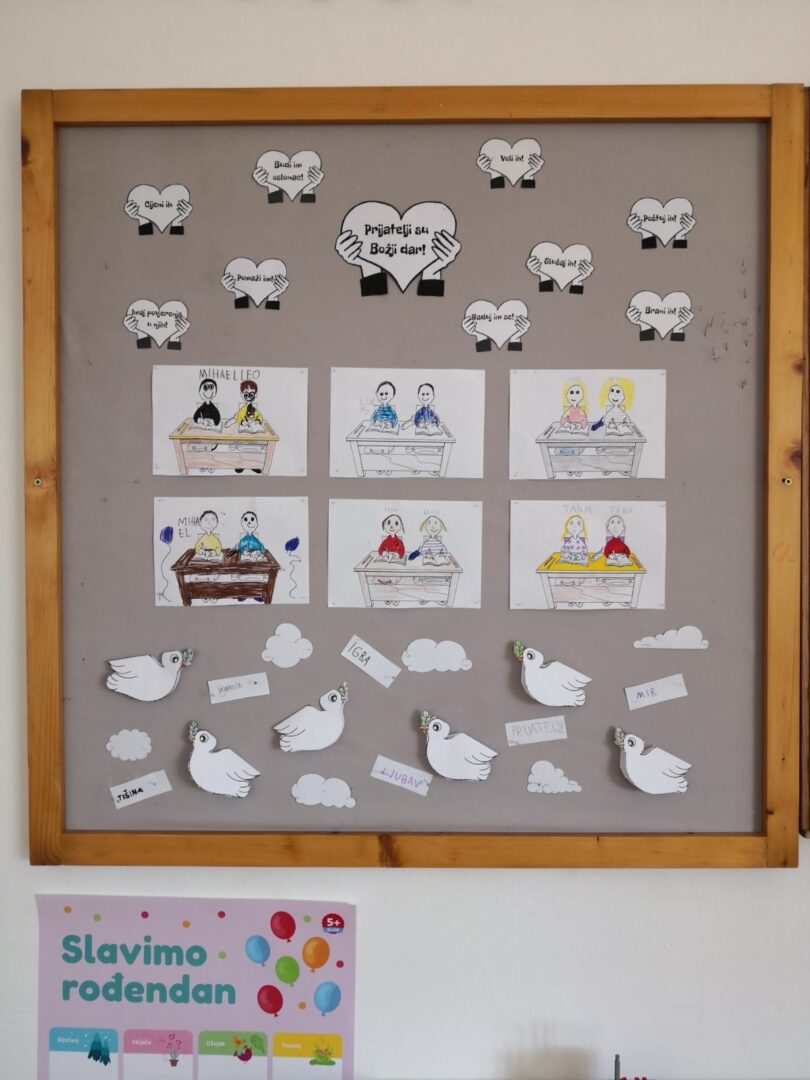 Povodom Dana mira, naši učenici i učenice svih razreda zajedno s vjeroučiteljicama na satovima vjeronauka sudjelovali su u aktivnosti gdje je zadatak bio napisati razrednu poruku mira, tolerancije i nenasilja. Poruke su zatim složene na zajednički školski plakat koji je izložen u holu matične i područnih škola.