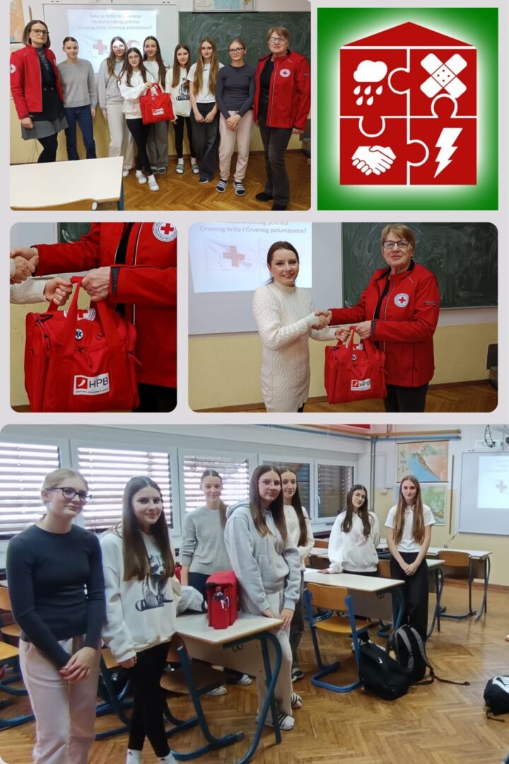 Torbu su nam uručile ravnateljica GDCK Pregrada Štefica Pasarić i djelatnica Petra Bešenski, na čemu im srdačno zahvaljujemo. Sadržaj torbe iskoristit ćemo za natjecanje u znanju i vještinama pružanja prve pomoći, za koje se ove godine pripremaju učenice 7. razreda. I ove školske godine ponovno nam je dodijeljena oznaka „Naša škola je sigurna“, a ova lijepa gesta Hrvatskog Crvenog križa dodatni nam je poticaj da i dalje sudjelujemo u provođenju aktivnosti i gradimo sigurnije školsko okruženje.
